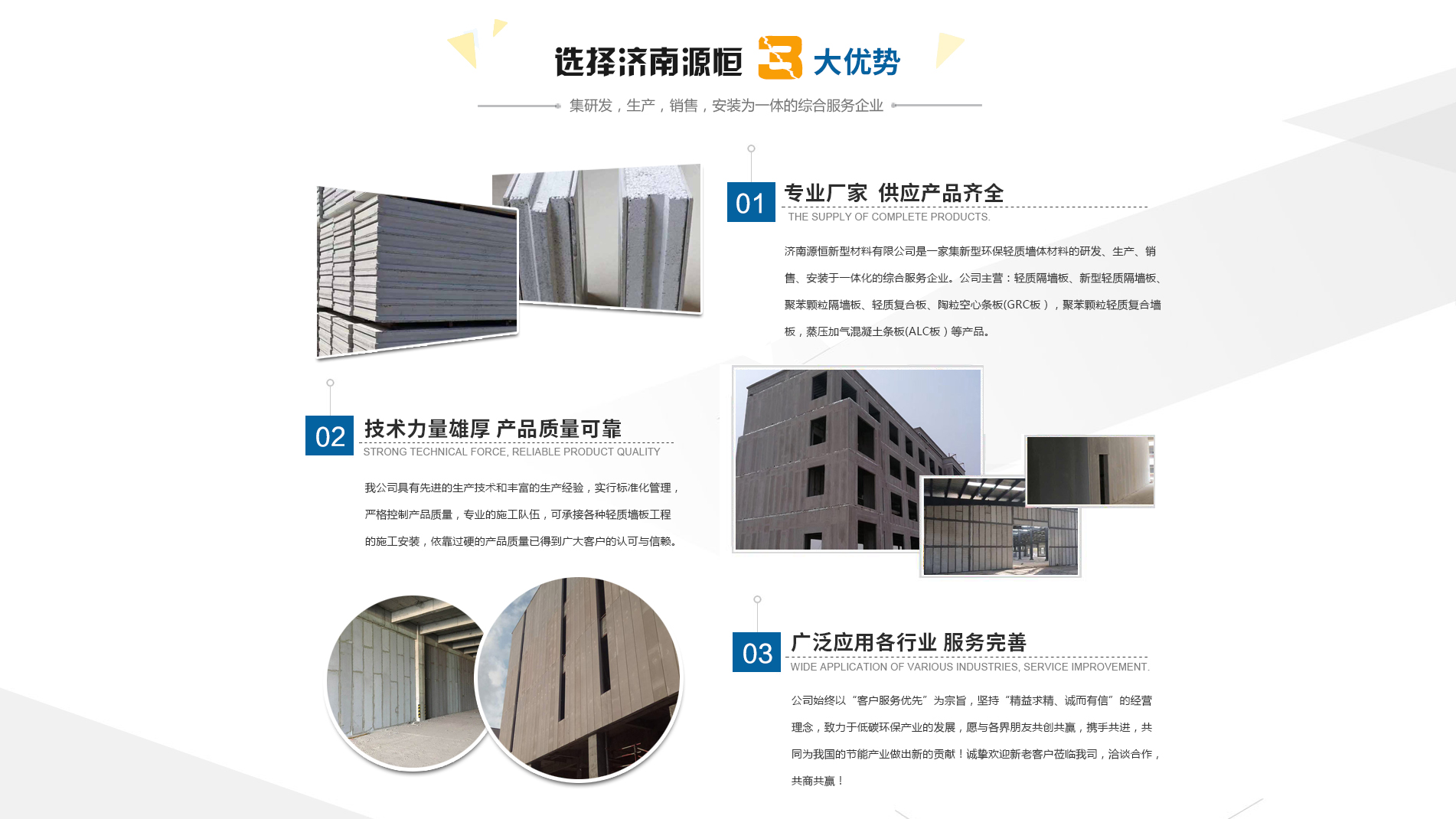 濟南源恒新型材料有限公司坐落于美麗的泉城濟南,是集新型環(huán)保輕質(zhì)墻體材料的研發(fā)、生產(chǎn)、銷售、安裝于一體化的綜合服務(wù)企業(yè)。我公司具有的生產(chǎn)技術(shù)和豐富的生產(chǎn)經(jīng)驗,為您提供輕質(zhì)隔墻板、新型輕質(zhì)隔墻板、聚苯顆粒隔墻板、輕質(zhì)復(fù)合板、陶??招臈l板(GRC板),聚苯顆粒輕質(zhì)復(fù)合墻板,蒸壓加氣混凝土條板(ALC板)等產(chǎn)品,本公司有專的施工隊伍,可承接各種輕質(zhì)墻板工程的施工安裝。輕質(zhì)隔墻板是國家推廣使用的新型輕質(zhì)、綠色無害建材,是墻改節(jié)能政策大力扶持的環(huán)保節(jié)能產(chǎn)品,是發(fā)達(dá)國家普遍采用的新型墻體材料。濟南源恒新型材料有限公司實行標(biāo)準(zhǔn)化管理,嚴(yán)格控制產(chǎn)品質(zhì)量,依靠過硬的產(chǎn)品質(zhì)量已得到廣大客戶的認(rèn)可與信賴。公司產(chǎn)品遍布各大城市,與國內(nèi)多家客戶建立了良好的合作關(guān)系。公司始終以“客戶服務(wù)優(yōu)先”為宗旨,堅持“精益求精、誠而有信”的經(jīng)營理念,致力于低碳環(huán)保產(chǎn)業(yè)的發(fā)展,愿與各界朋友共創(chuàng)共贏,攜手共進,共同為我國的節(jié)能產(chǎn)業(yè)做出新的...